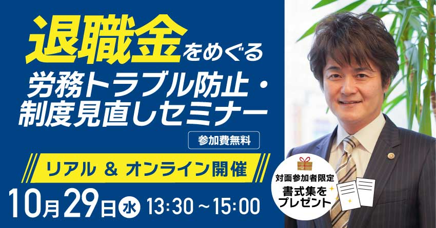 本セミナーでは、貴社退職金規程の危険度をセルフ診断し(希望者無料)、退職金に絡む労務トラブルを回避するポイントを整理します。