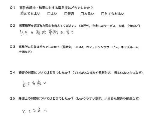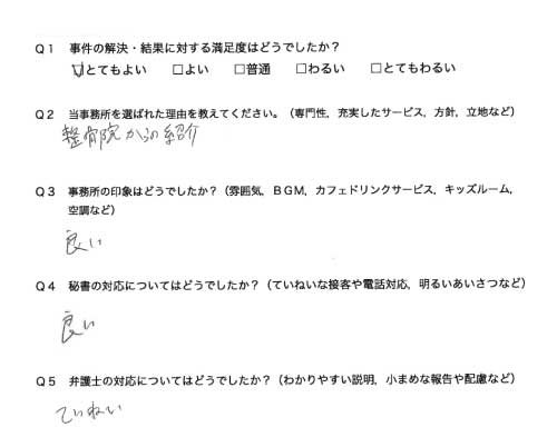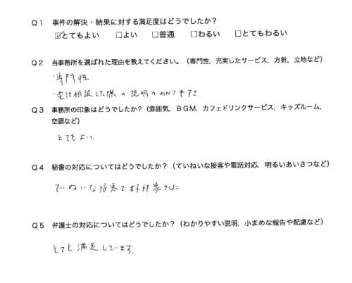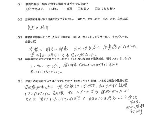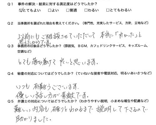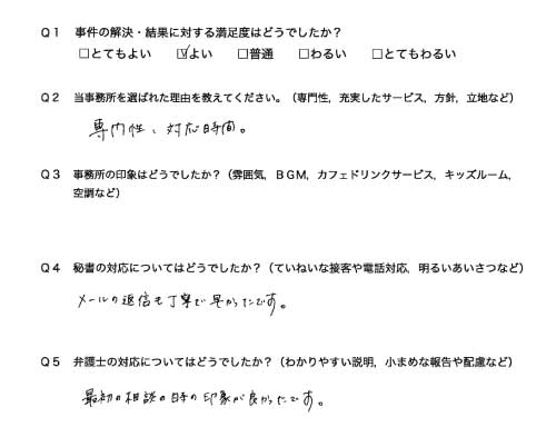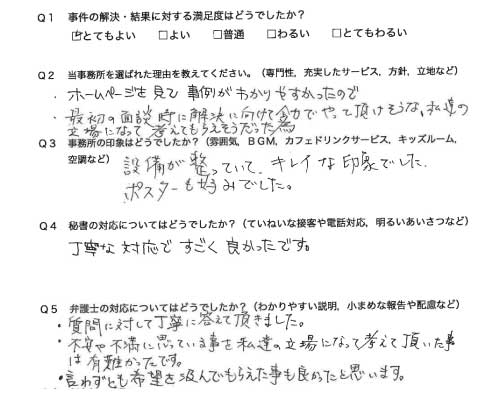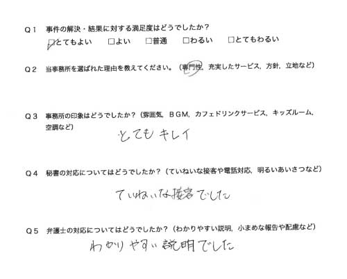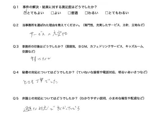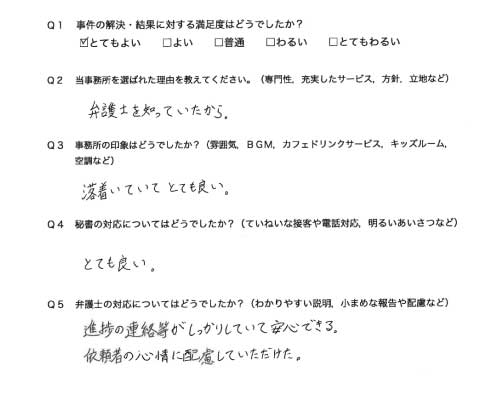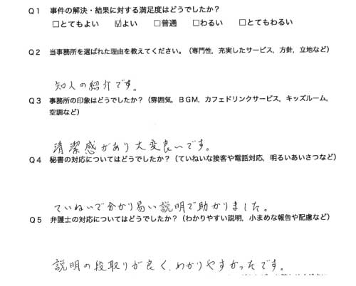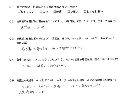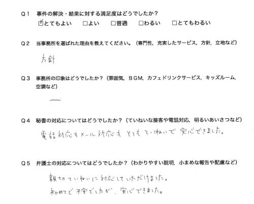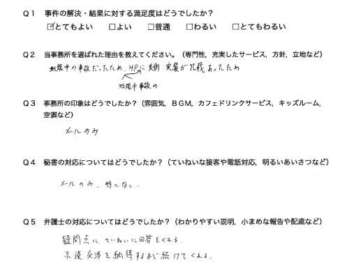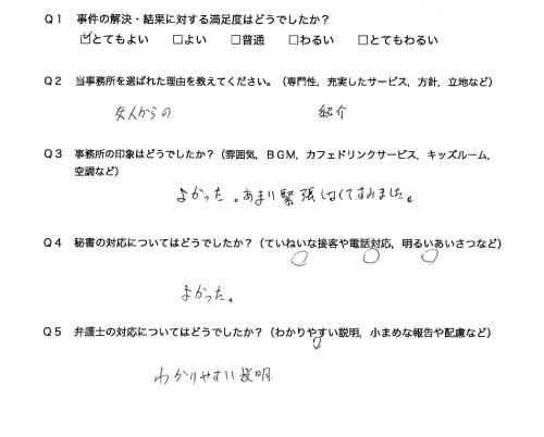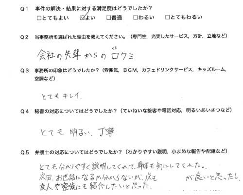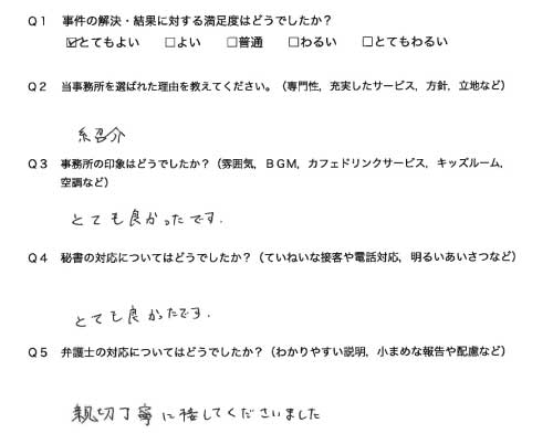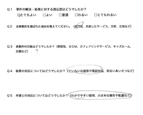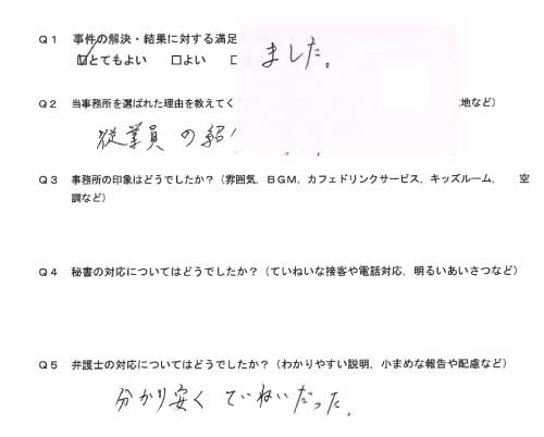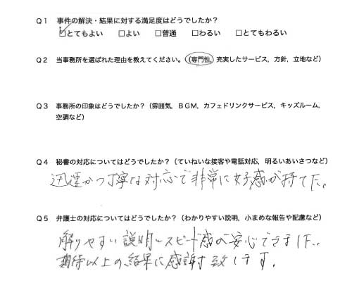 選んで頂いた理由や雰囲気、弁護士と事務員の対応や結果の満足度についてお客さまの率直なご意見をお答え頂いていますので是非ご参考にされて下さい。
