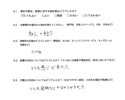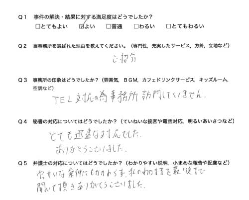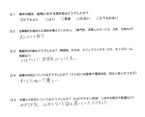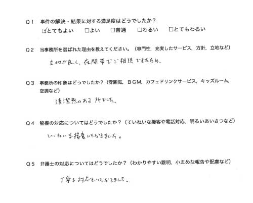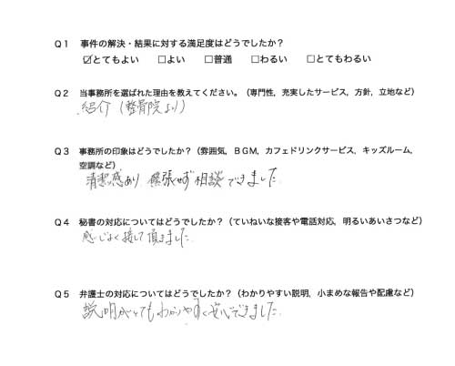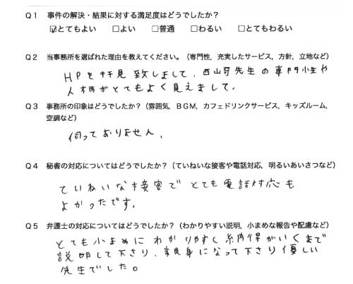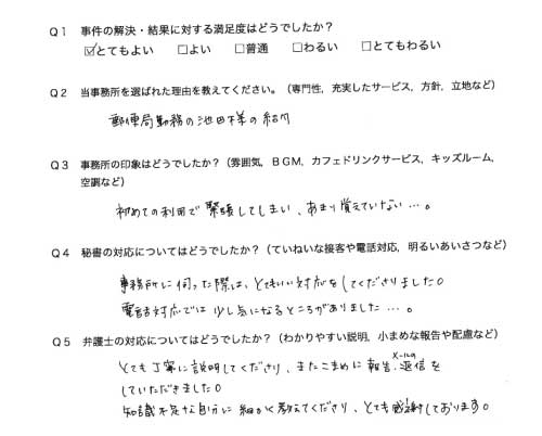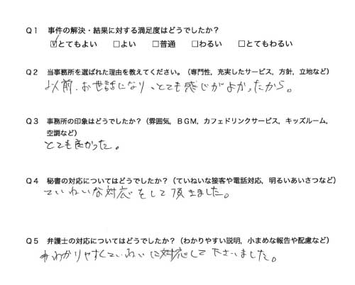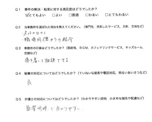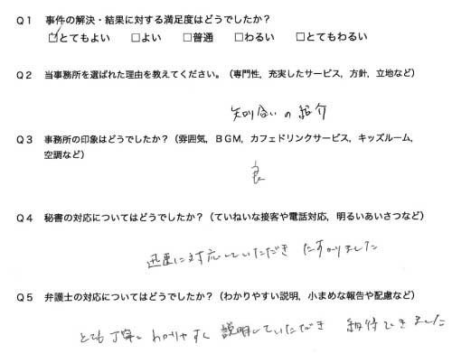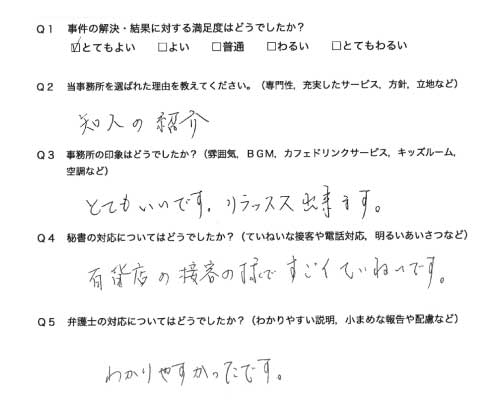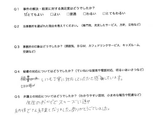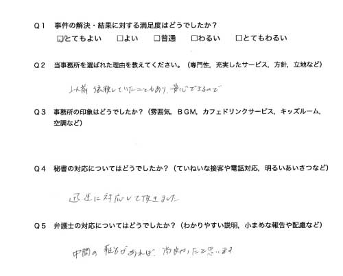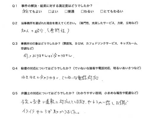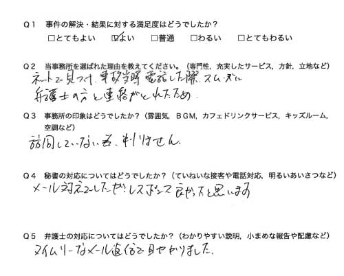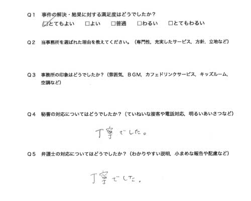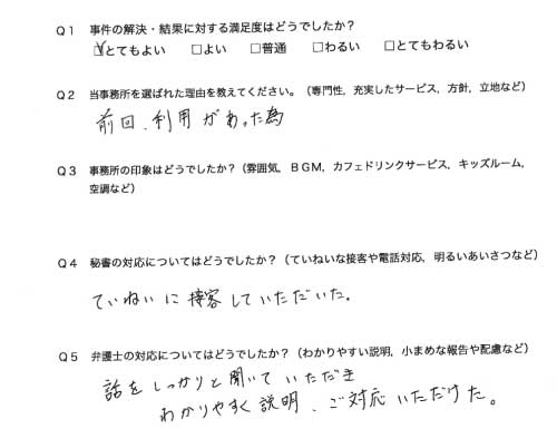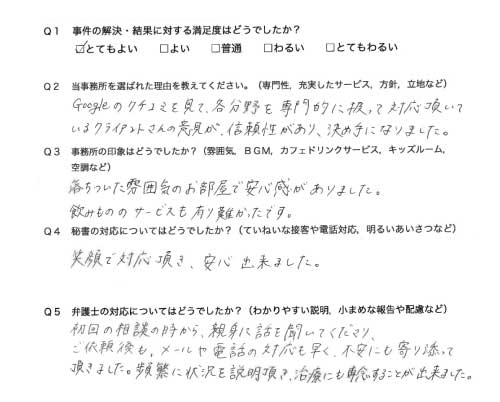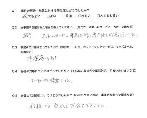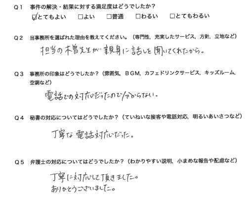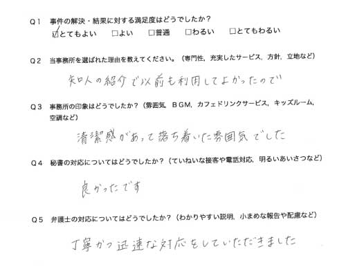 選んで頂いた理由や雰囲気、弁護士と事務員の対応や結果の満足度についてお客さまの率直なご意見をお答え頂いていますので是非ご参考にされて下さい。