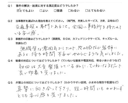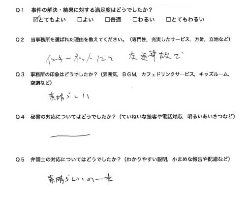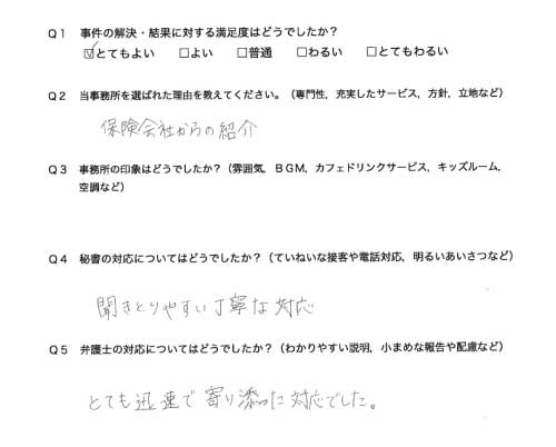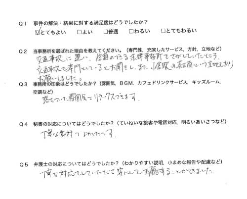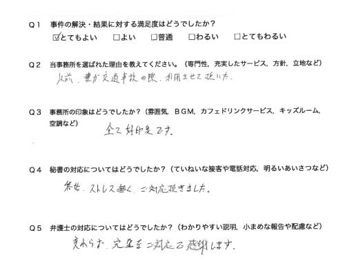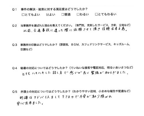御社のHPを拝見させて頂き交通事故対応の専門性や実績がある事務所と思い依頼をさせて頂きました。
