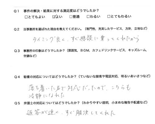 当方の悩みに親身になって相談に乗って頂き相談内容も素早く、わかりやすく説明頂き本当に助かりました。ありがとうございました。改めてお礼申し上げます。