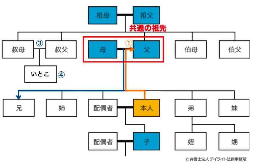 直系の親族であれば一直線に数えればよいのですが、兄弟姉妹などの傍系親族の場合は、いったん共通の祖先まで遡ってから目的の人物まで降りる必要があるため、少し複雑になります。