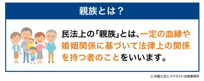 民法上の「親族」とは、一定の血縁や婚姻関係に基づいて法律上の関係を持つ者のことをいいます。