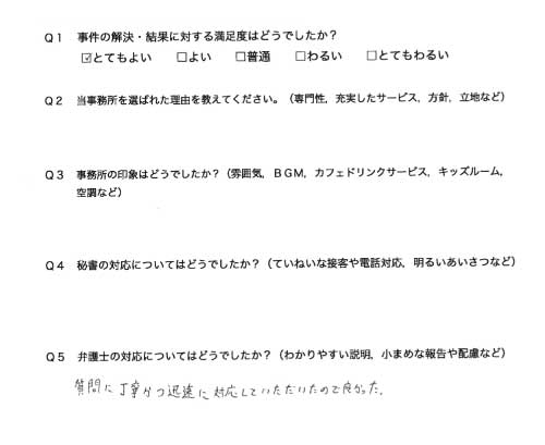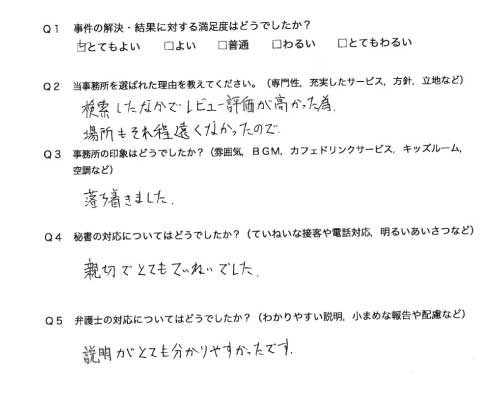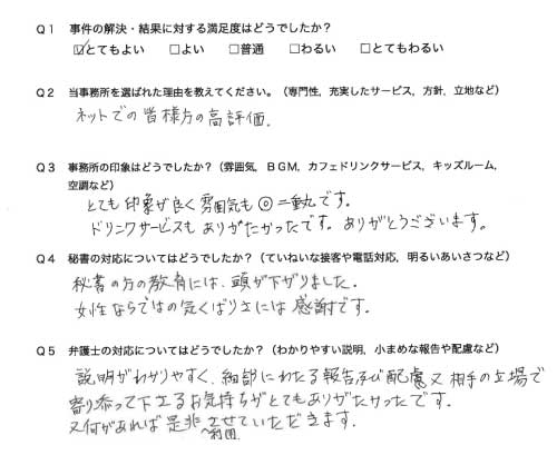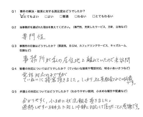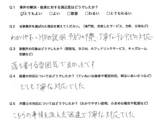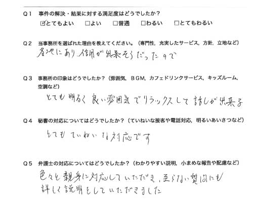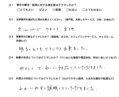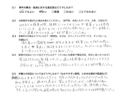 選んで頂いた理由や雰囲気、弁護士と事務員の対応や結果の満足度についてお客さまの率直なご意見をお答え頂いていますので是非ご参考にされて下さい。
