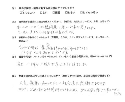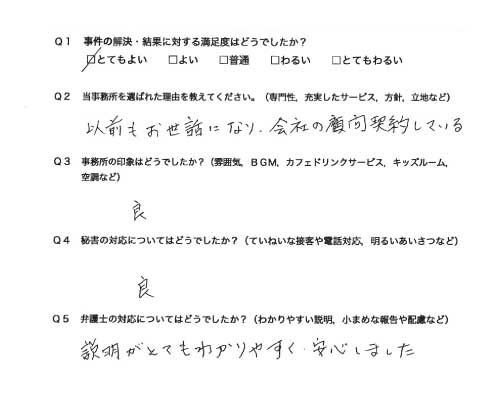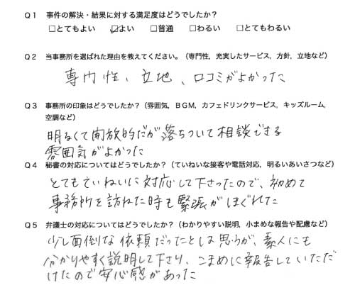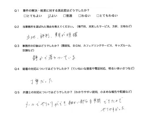 今回御依頼した内容は、私の説明が長くまとまりにくかったのですが、要点を的確に説明していただいて分かりやすくなりました。メールでの相談もそのつどお返事いただく等のご配慮いただきました。