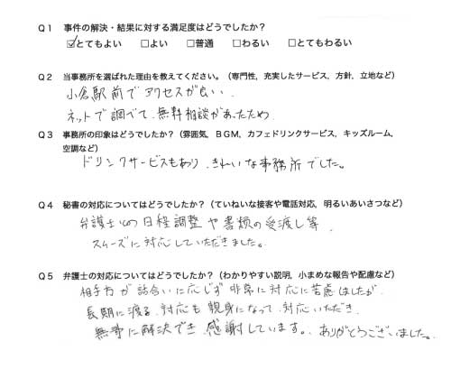 相手方が話し合いに応じず非常に対応に苦慮しましたが、長期にわたる対応にも親身になって対応いただき、無事に解決でき感謝しています。