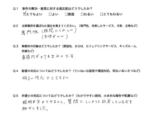 相続の件でご相談してから2ヶ月弱で公正証書を作成することが決まりました。当日公正役場で高齢の母に先生がていねいに説明してくださり母も心強かったと思います。母も私もこれからの日々を過ごせます。ありがとうございました。